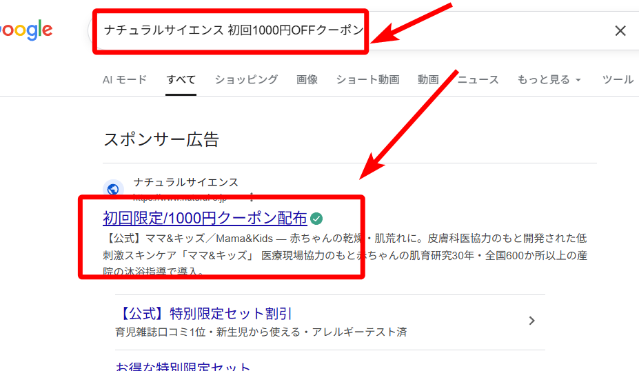 1.Googl検索で「ナチュラルサイエンス 初回1000円OFFクーポン」と検索
