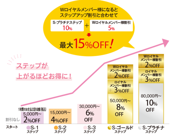 - 最大10〜15%OFFまで自動割引(ステップアップ特典)