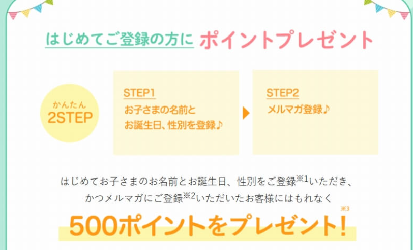 公式サイトで、はじめて子どもの名前・誕生日・性別を登録し、メルマガに登録すると500ポイントがもらえます。ポイントは登録の翌月15日までに付与されます。