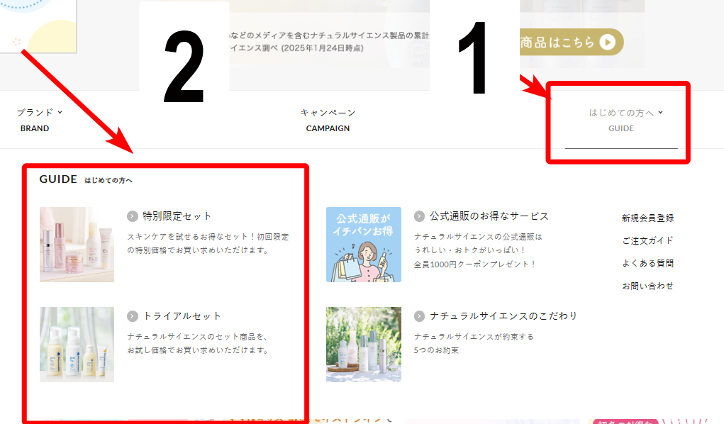 トップページ上部「初めての方へ」をクリックするとキャンペーンページに入場できます。
