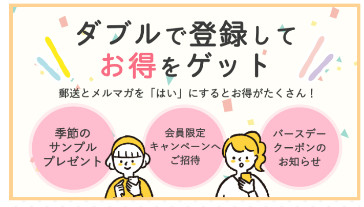 A. 誕生日前月1日までの誕生日登録、直近1年以内の購入履歴、メルマガと郵送DMの双方を“はい”設定が必要です。