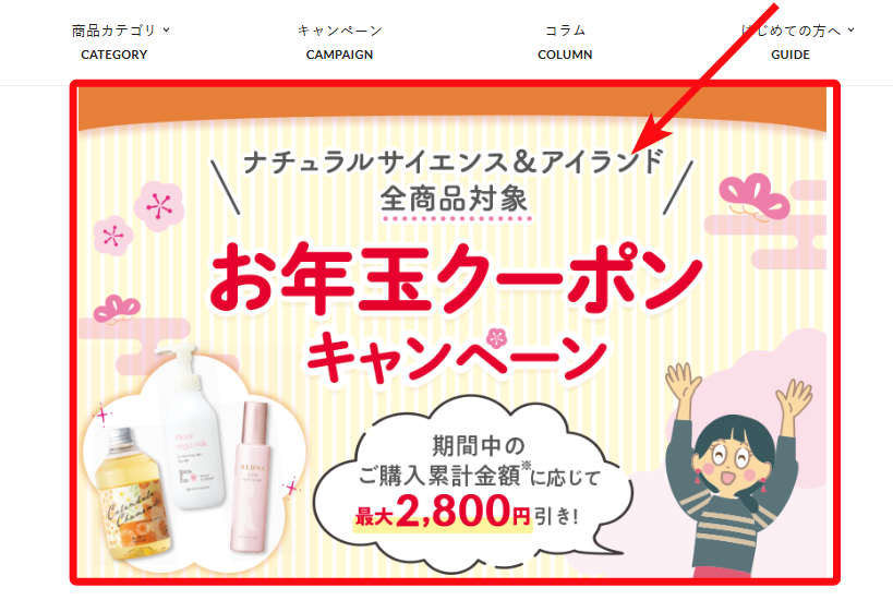- 対象商品:ママ&キッズやレドナのスペシャルケアアイテム、ナチュラルアイランドのアイテムなど、大人気の商品(数量限定、売り切れ次第終了)