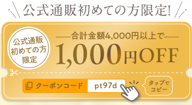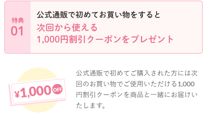 2.「初回限定1000円クーポン配布」と検索結果にあり、サイトに初回からつかえるクーポンコードが記載してあります。