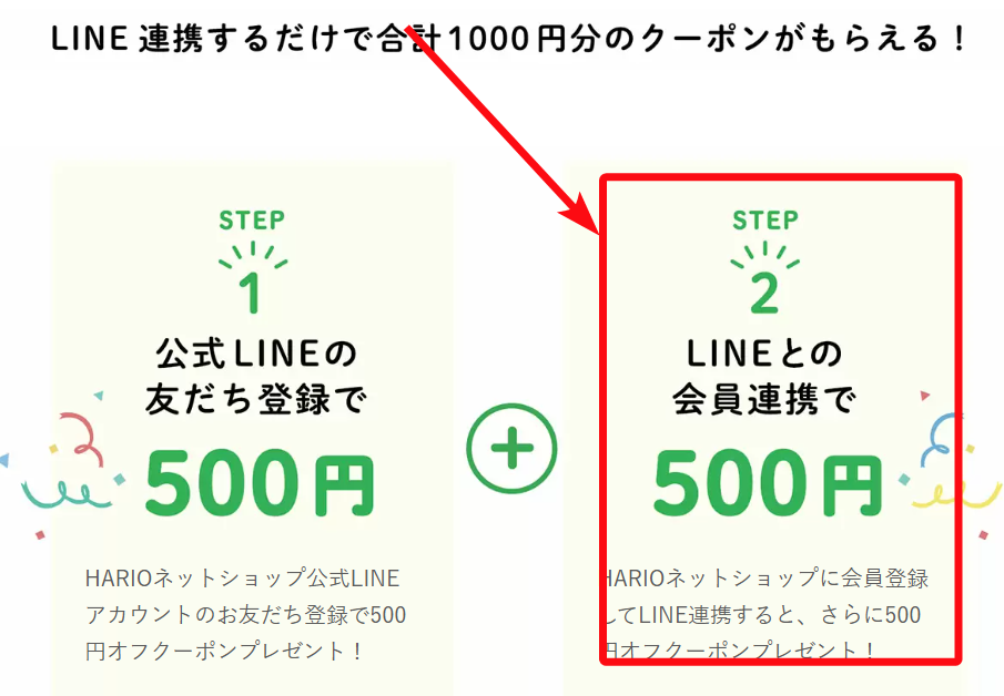 LINEと「HARIOネットショップのアカウントを連携」すると追加で500円クーポン(合計1000円分)がもらえます。
