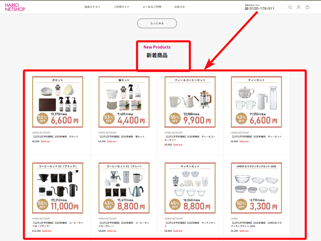 福袋予約コーナーはトップページを下へスクロールしていくと表示されています。