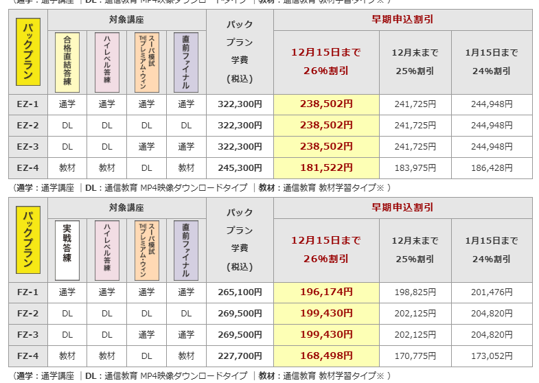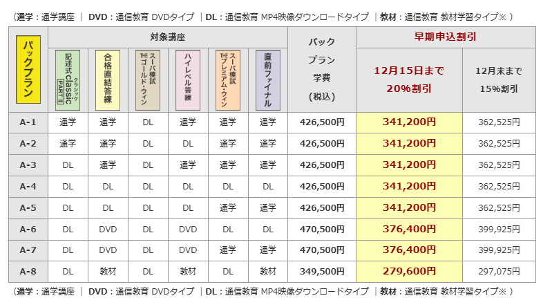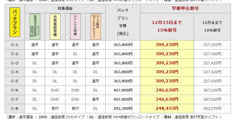 | フルパックコース 映像ダウンロード | P01 | 155,650円 | 93,390円 | 108,955円 | 124,520円 |