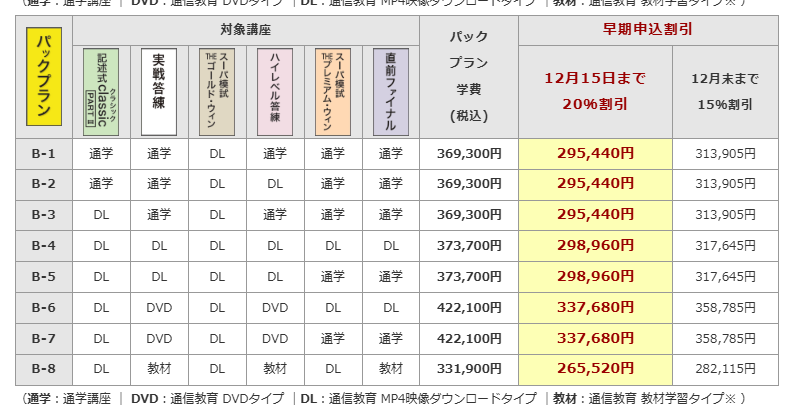 | 答練+科目別強化コース 映像ダウンロード | P07 | 144,650円 | 86,790円 | 101,255円 | 115,720円 |