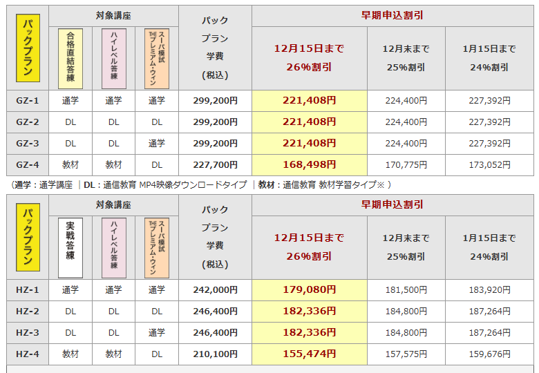 | 答練+記述式特訓コース 映像ダウンロード | P05 | 133,650円 | 80,190円 | 93,555円 | 106,920円 |