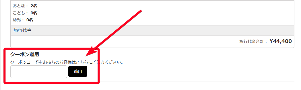 2.対象商品の予約を進め、お支払方法選択ページに「クーポンコード入力欄」が表示されますので、旅行代金合計に応じた利用可能なクーポンコードを貼付け入力してください。