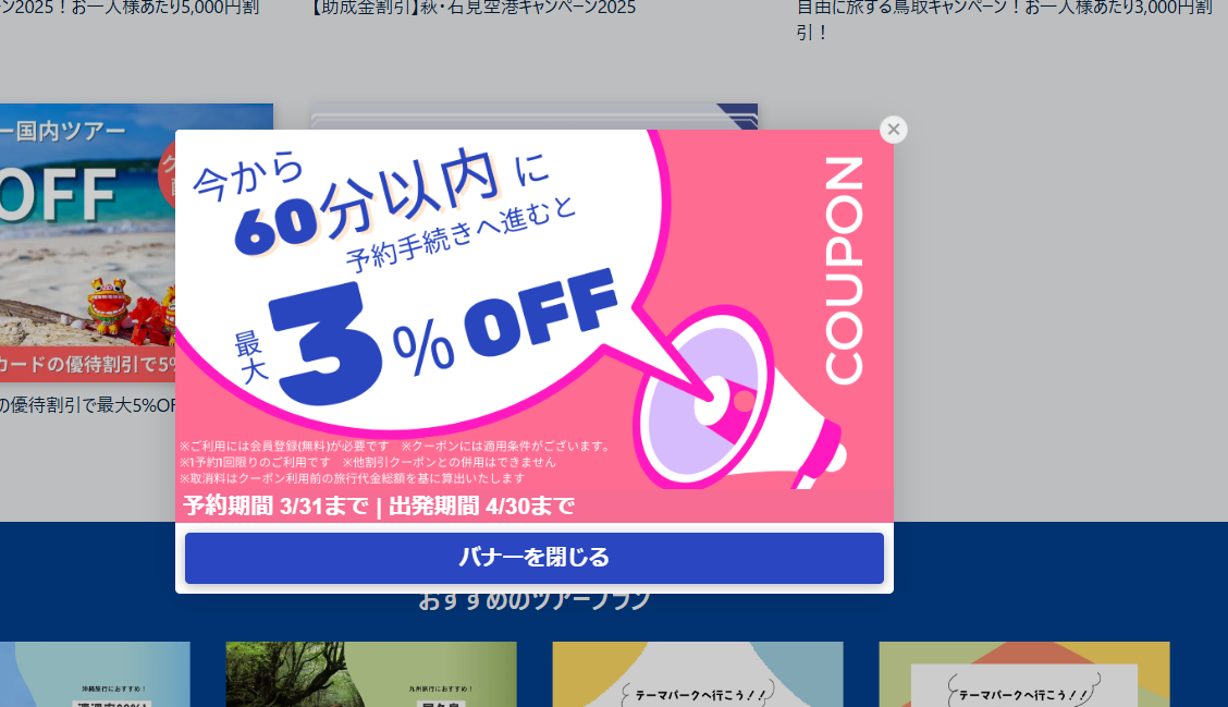 ビッグホリデーでツアーをチェックしていると、突然「60分限定3%OFFクーポン」が表示されることがあります。