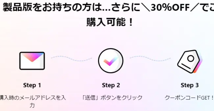 Wondershare公式サイトで購入時に使用したメールアドレスを登録すると、30%OFFクーポンがもらえます。