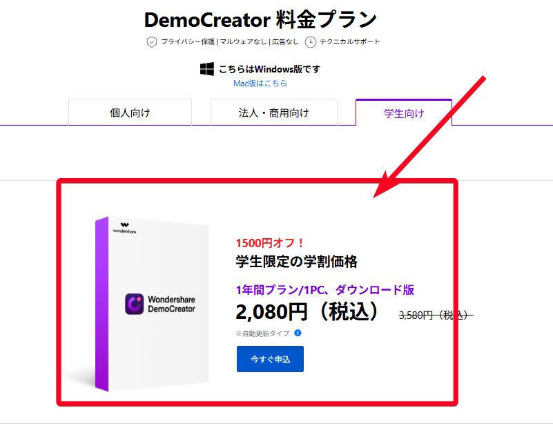 学生限定の1年間プランが割引価格で登場!通常3,580円のところ、1,500円オフの2,080円(税込)で利用可能。