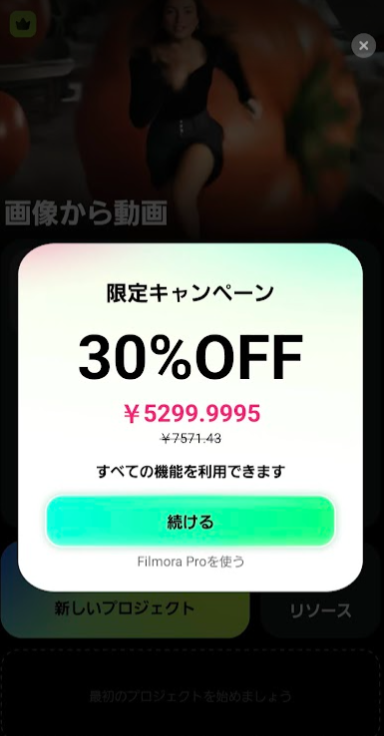 Filmoraアプリをダウンロードして開くと、すぐ30%OFFの割引クーポンを取得できますが、このクーポンはスマホやタブレットのアプリ内のみで使えます。パソコンのブラウザからは使えません。
