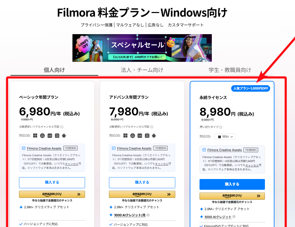 | 個人向け | 永続ライセンス(買い切り) | 12,900円 | ー | PC3台、Web/モバイル3台(3年間無料特典)、10GBクラウド付き |