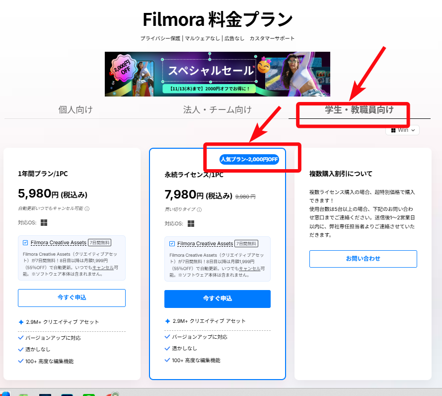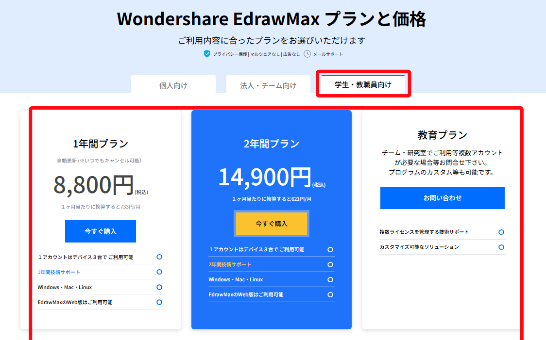 | 学生・教職員向け | 2年間プラン | 7,900円 | - | 2PC&3モバイル対応、2年間技術サポート |