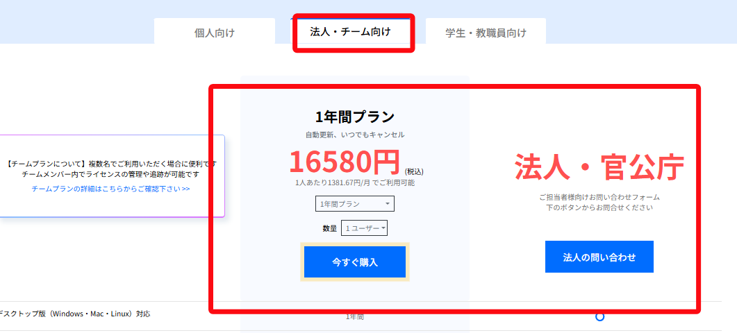| 法人・チーム向け | 1年間プラン | 9,180円 | - | チームメンバー権限管理付き PC3台、Web/モバイル3台対応 技術サポート・無料アップデート 1GBクラウドストレージ |