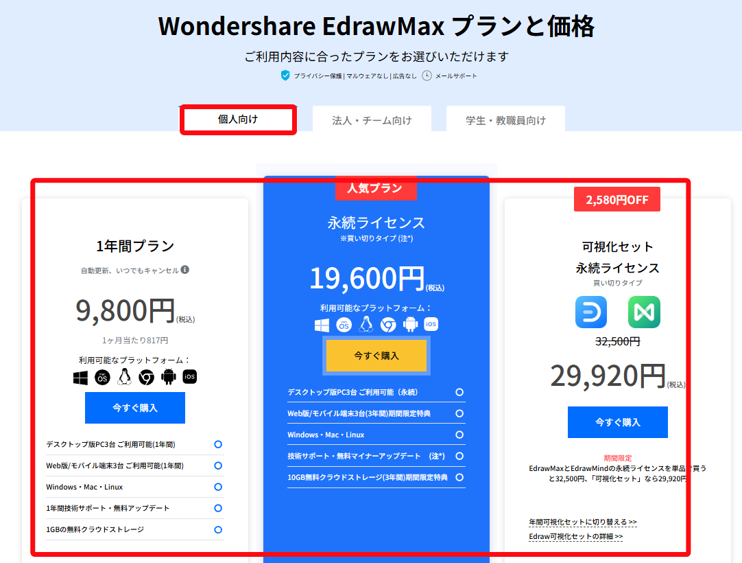 | 個人向け | 可視化セット(EdrawMind+EdrawMax) | 32,500円 → 29,920円 | 約8%OFF、約2,580円お得 | 両製品使えるセットプラン |