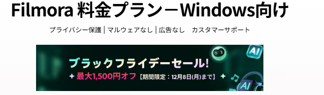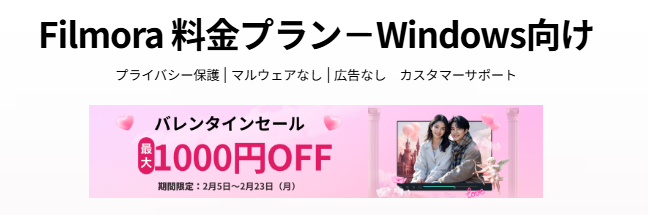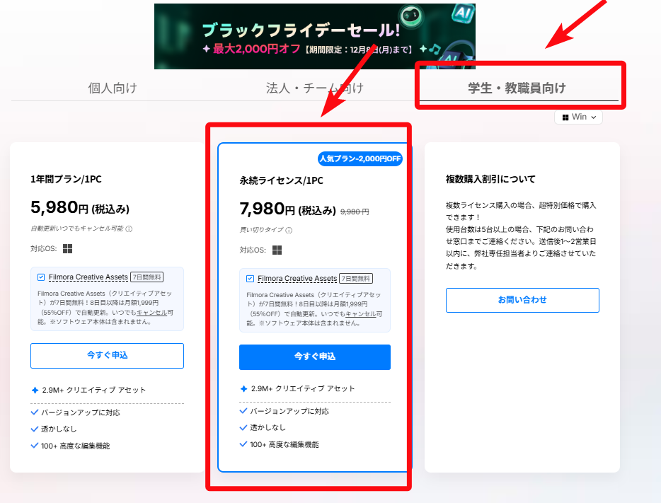 | Filmora | 永続ライセンス | 9,980円 | 7,980円 | 2,000円(20%OFF) | 学生・教職員 |