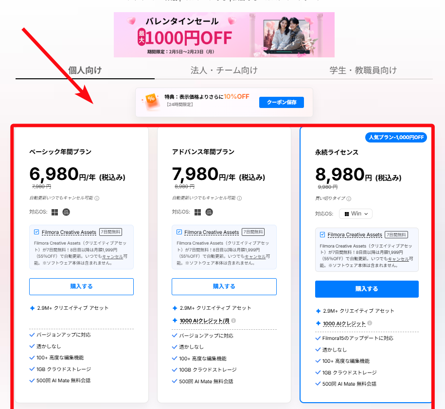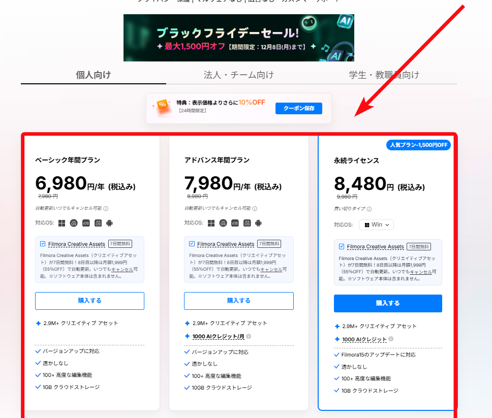 個人向けプランは最大90%OFFのセール中。プロ版永続ライセンスなら**9,980円(通常80,040円)**で全機能買い切り可能。