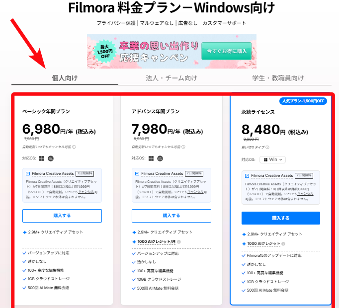 ▼Filmora 料金プラン