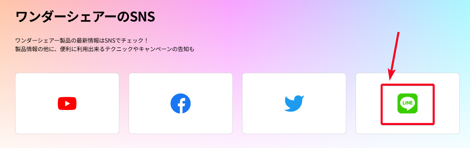 ワンダーシェアーのSNSの一番右のLINEアイコンをクリックすると登録できます