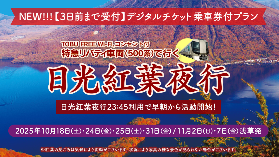 2席ゆったりプラン+500円カフェ割引券!日光紅葉夜行列車