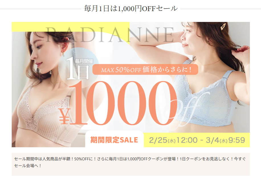 ラディアンヌ公式サイトでは、毎月1日などに5,000円以上カートに入れると、自動で「1,000円OFF」が適用されます。しかし、そのまま決済すると損をします!