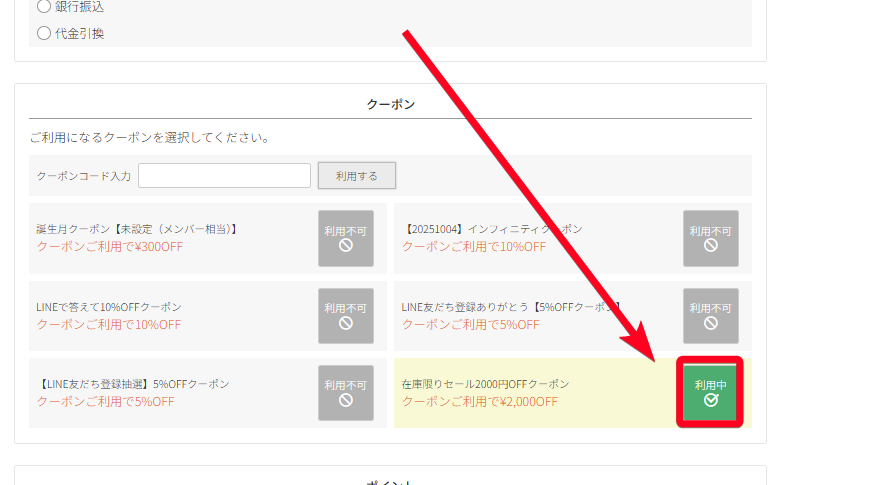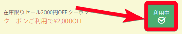 ※他のクーポンが選択になっているときは、クーポンバナー右の「利用中ボタン」を押してクーポンをリセットしてから、再度「在庫限りセール2000円OFFクーポン」を押すとクーポン適用になります。