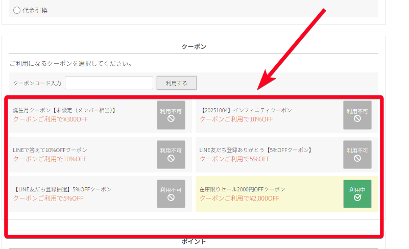 ◆クーポンコードは決済画面で一度登録すると以下の通り一覧で表示されます。