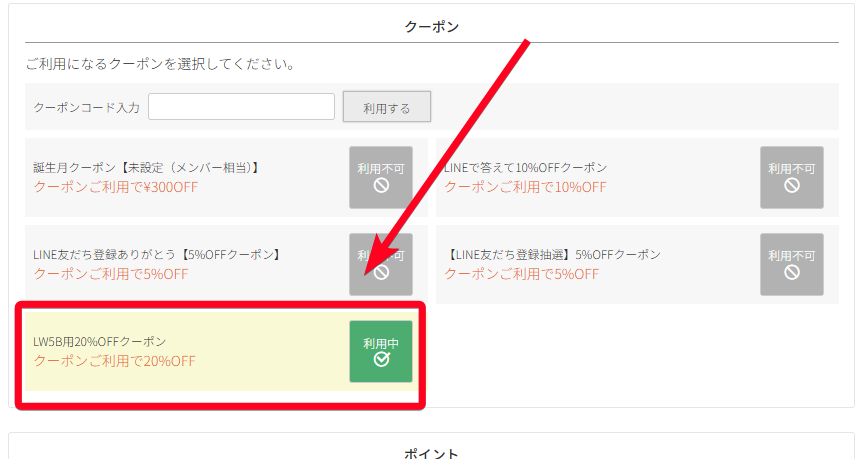 体験:セール中に10%OFFクーポンコード:LINE10CPとポイントを一緒に利用したら