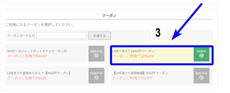 4.「利用する」をクリックで"クーポン利用中”が選択されて割引適用になります。