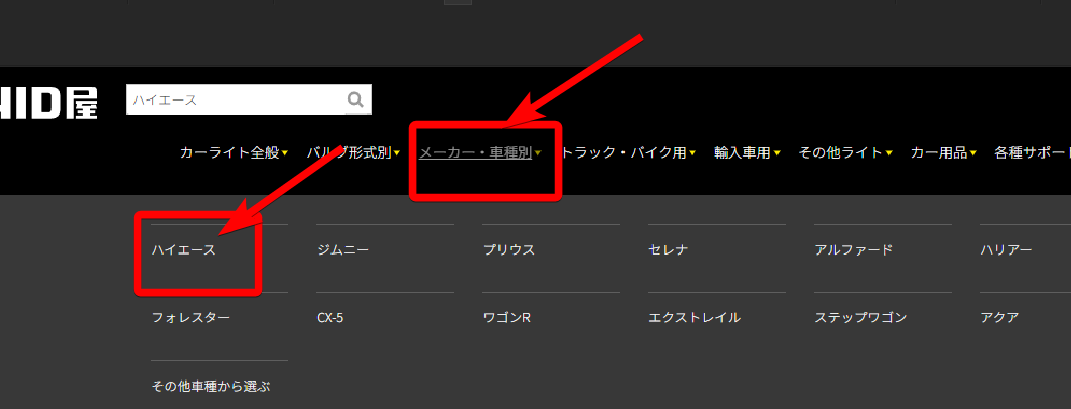 1.パソコンは、上部メニュー「車種別」>「ハイエース」選んでをクリック