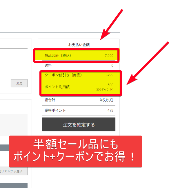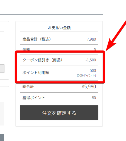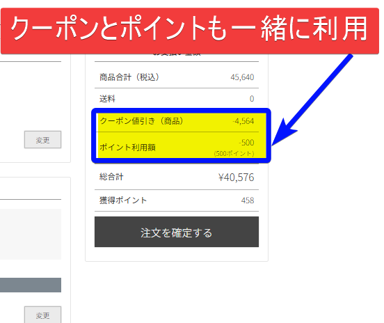 4.ポイントとクーポンが両方適用されているか確認して注文完了