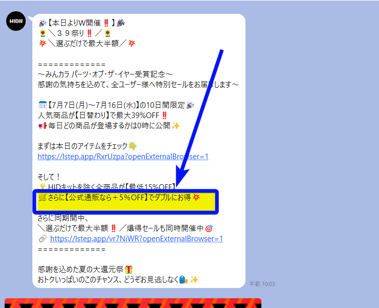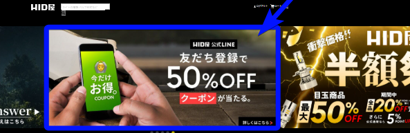 1.HID屋TOPバナー「友だち登録で50%OFF」をクリックして友だち追加