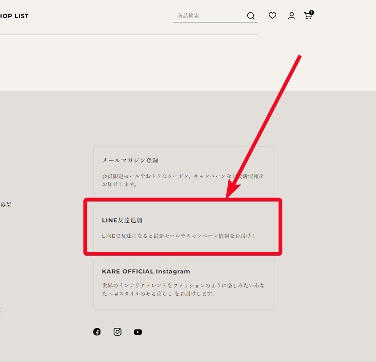 1.トップ画面最下部「LINE友だち追加」をクリックしてLINE登録をする