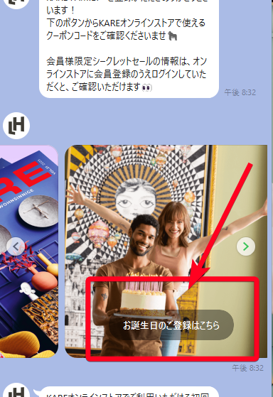 LINE友だち登録後に届くお誕生日アンケートに回答するとその場でクーポンコードがもらえます。