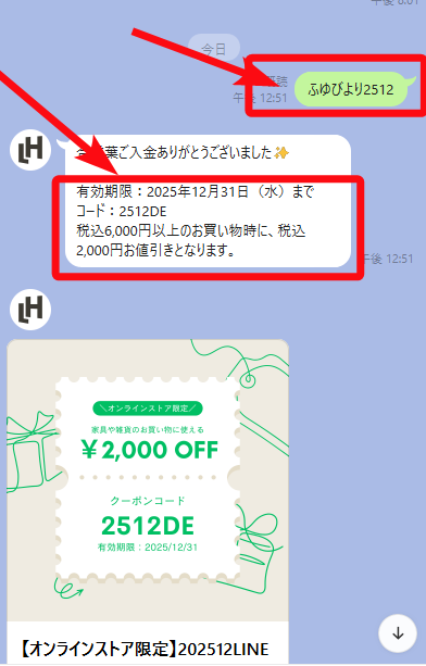 クーポンコードはLINEトーク画面に届きます。