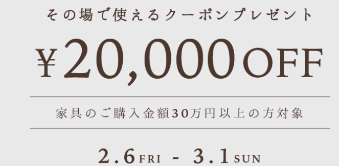 | 🥈 2位 | 【20,000円OFF】大型購入クーポン | セール対象外の家具を30万円以上まとめ買いする方 |