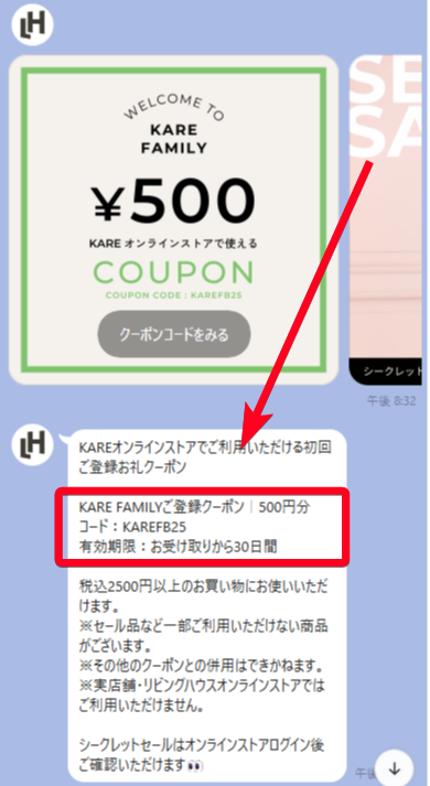 【LINEお友だち登録】をしておくとクーポン、セール・キャンペーンなどの情報がいちはやくゲットできます。筆者はトーク画面秘密の言葉「0304しんせつ」を入力して2,000円クーポンコードなどをもらったことがあります。