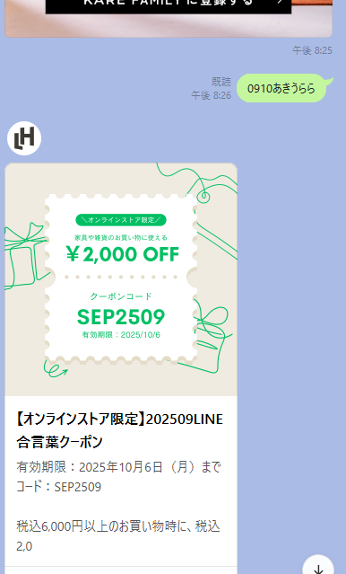 2.トーク画面に「0910あきうらら」と入力でもらえます。