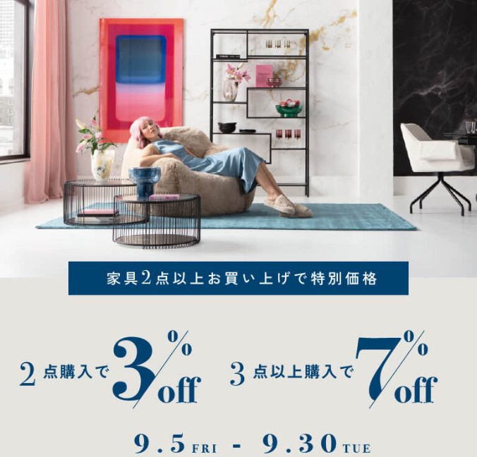 このキャンペーンは、家具・照明・ラグカテゴリーの商品をまとめ買いすると割引率がアップする仕組みです。購入点数によって 2点 → 3%OFF、3点以上 → 7%OFF が適用されます。